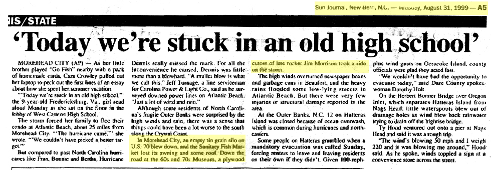 The last year of her life was no exception. On August 27th, 2011 she was so ill and could hardly move from the couch when Hurricane Irene struck the coast leaving over a million people without electricity. Back on August 27th, 1999 Hurricane Dennis was still offshore and had just been upgraded to a category 2 status. The storm hit the outer banks on August 30th. An interesting article appeared August 31, 1999 Sun Journal (New Bern). It told of the damage along the coast and mentioned the Jim Morrison sign in front of Phyllis's shoppe: